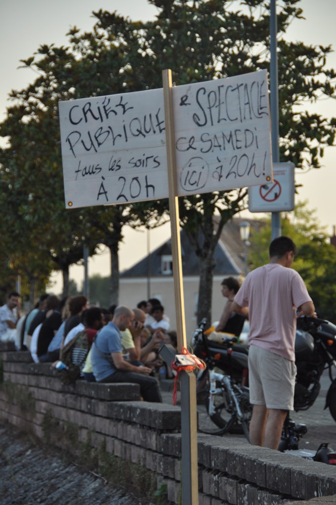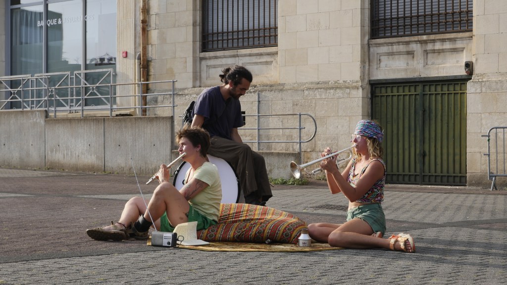 improvisations en espace public, Criées publiques régulières, ateliers avec le centre social de Tunnel Château et centre d’animation de la Noue avec la fabrication de pancartes, de marionnettes, d’instruments de musique et exploration urbaine.